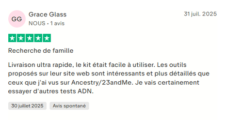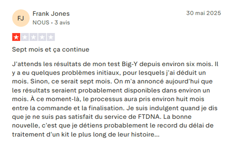 Avec une note de 3,9/5 sur 218 avis sur Trustpilot, FTDNA semble plutôt bien perçu. Mais que disent exactement les utilisateurs ? Analysons leurs retours de plus près.