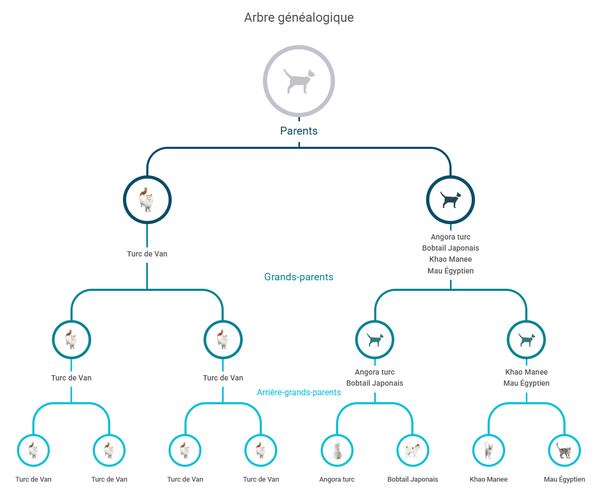 Cette fonctionnalité permet de visualiser la lignée génétique de votre animal sur plusieurs générations. L’arbre se construit automatiquement au fur et à mesure que d’autres animaux apparentés rejoignent la base de données. Vous pouvez explorer les branches familiales et découvrir des cousins éloignés.