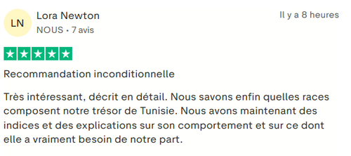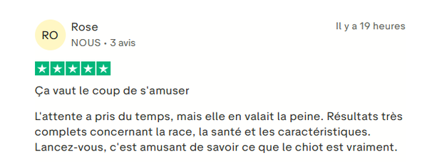 Les clients apprécient la rapidité de livraison des résultats, parfois même en avance, et leur cohérence avec le physique ou le caractère de leur animal. D’autres apprécient la clarté des explications et la simplicité du prélèvement, même pour un chien adopté au profil complexe.