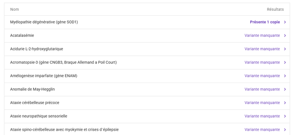 Ce rapport dresse une liste des traits physiques et comportementaux inscrits dans l’ADN de votre animal. Chaque trait détecté s’accompagne d’une mention claire, comme faible probabilité ou non exprimé, etc..