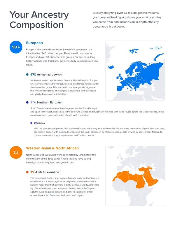Le rapport d’ascendance, basé sur plus de 83 millions de variantes génétiques, se présente sous forme de PDF avec les pourcentages par région (35) et une cartographie interactive. SelfDecode analyse également votre ADN mitochondrial pour présenter dans son rapport les anciens schémas migratoires de vos ancêtres maternels sur 230 000 ans.