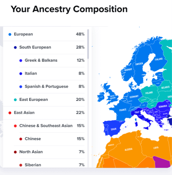 Tout comme SelfDecode, 23andMe propose une analyse de l’ascendance et de la santé. Il analyse plus de 3 000 régions géographiques pour découvrir vos origines et étudie également vos traits et prédispositions de santé.