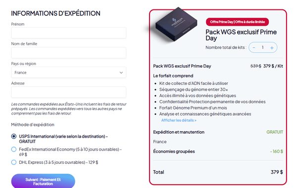 Pack WGS exclusif pour le prime day | 859 $ (environ 790 €) | Délai de traitement de 6 à 8 semaines 1 mois de plan premium 11 rapports de santé |