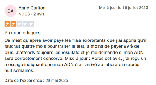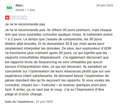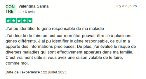 Les utilisateurs louent la réactivité et l’efficacité du service client. Les rapports ADN sont jugés riches, clairs et accessibles. Beaucoup apprécient la fiabilité des résultats et la transparence, notamment pour obtenir des réponses concrètes sur l’origine de maladies ou prédispositions familiales.