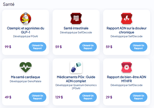 En plus de ces applications, vous pouvez acquérir des options à partir de 59 $ telles que : Ozempic and GLP-1 Agonist, MTHFR DNA Wellness Report).